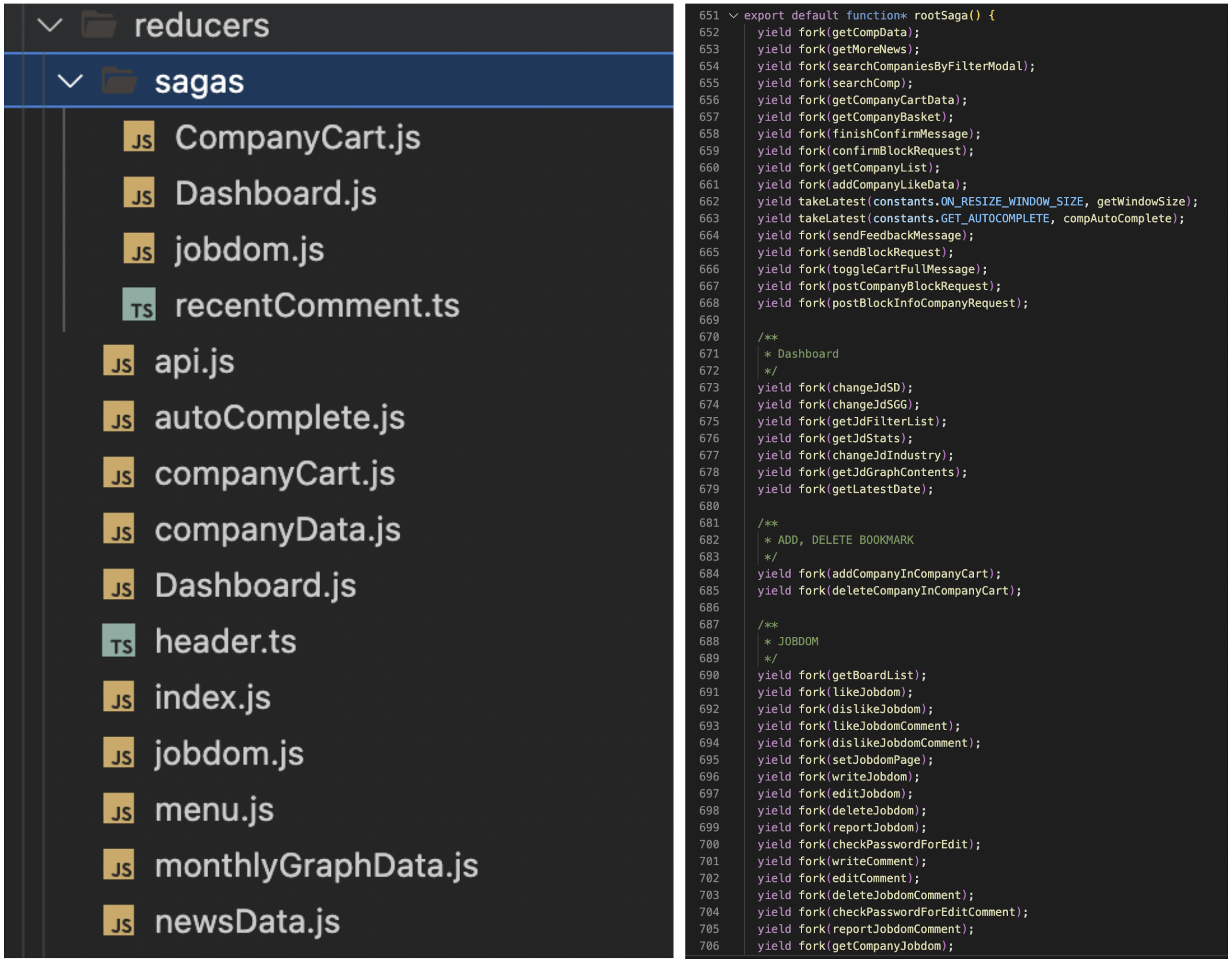 - 복잡한 Saga 코드: 하나의 파일에서 여러 Saga가 작성되어 700줄이 넘는 코드가 혼재되어 있었습니다. 이는 사이드 이펙트를 유발할 가능성이 높고, 의존성이 강해 수정이 어려웠습니다.