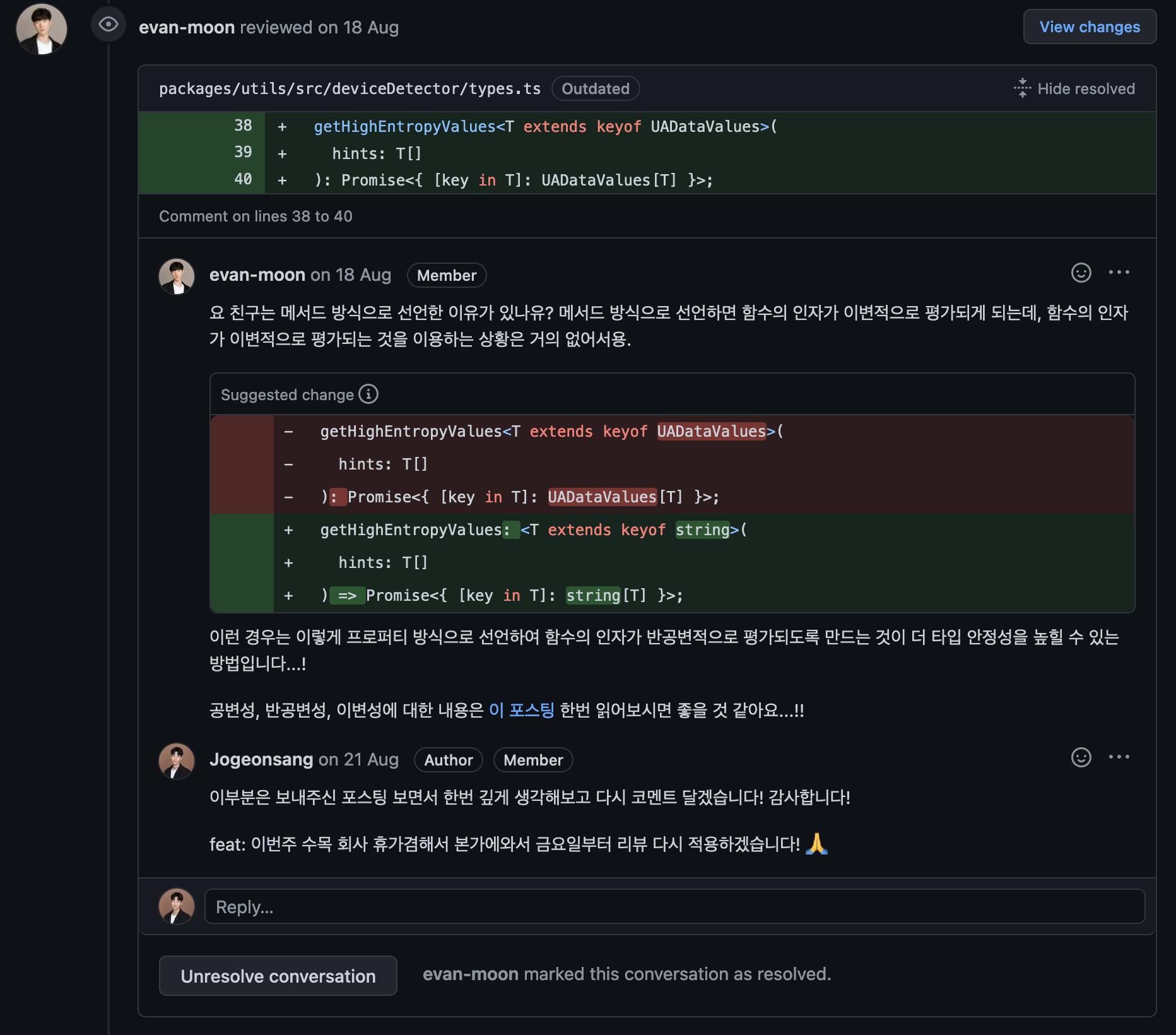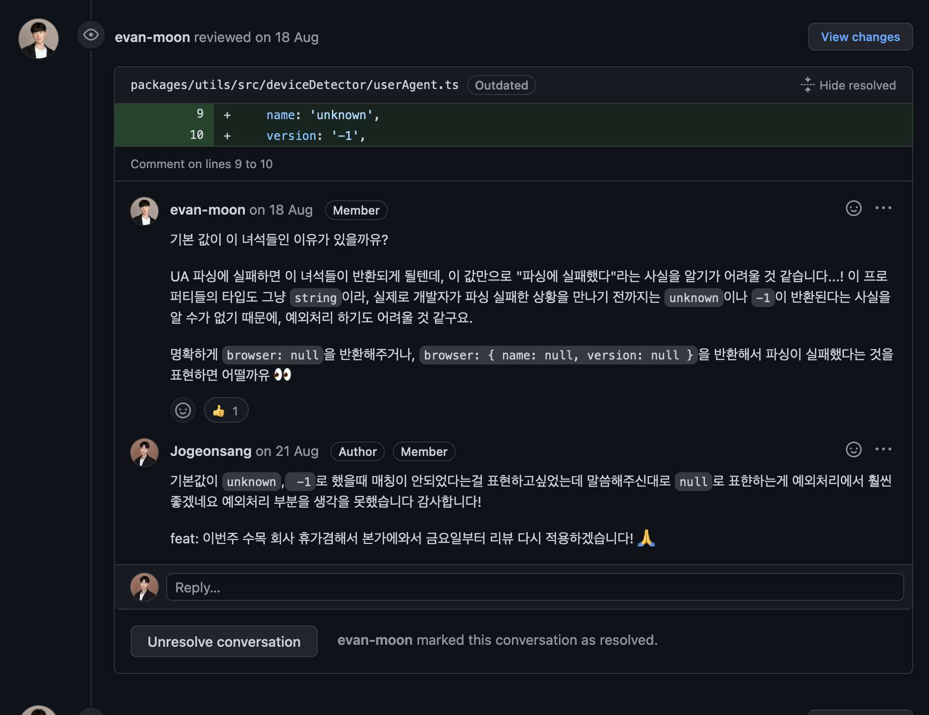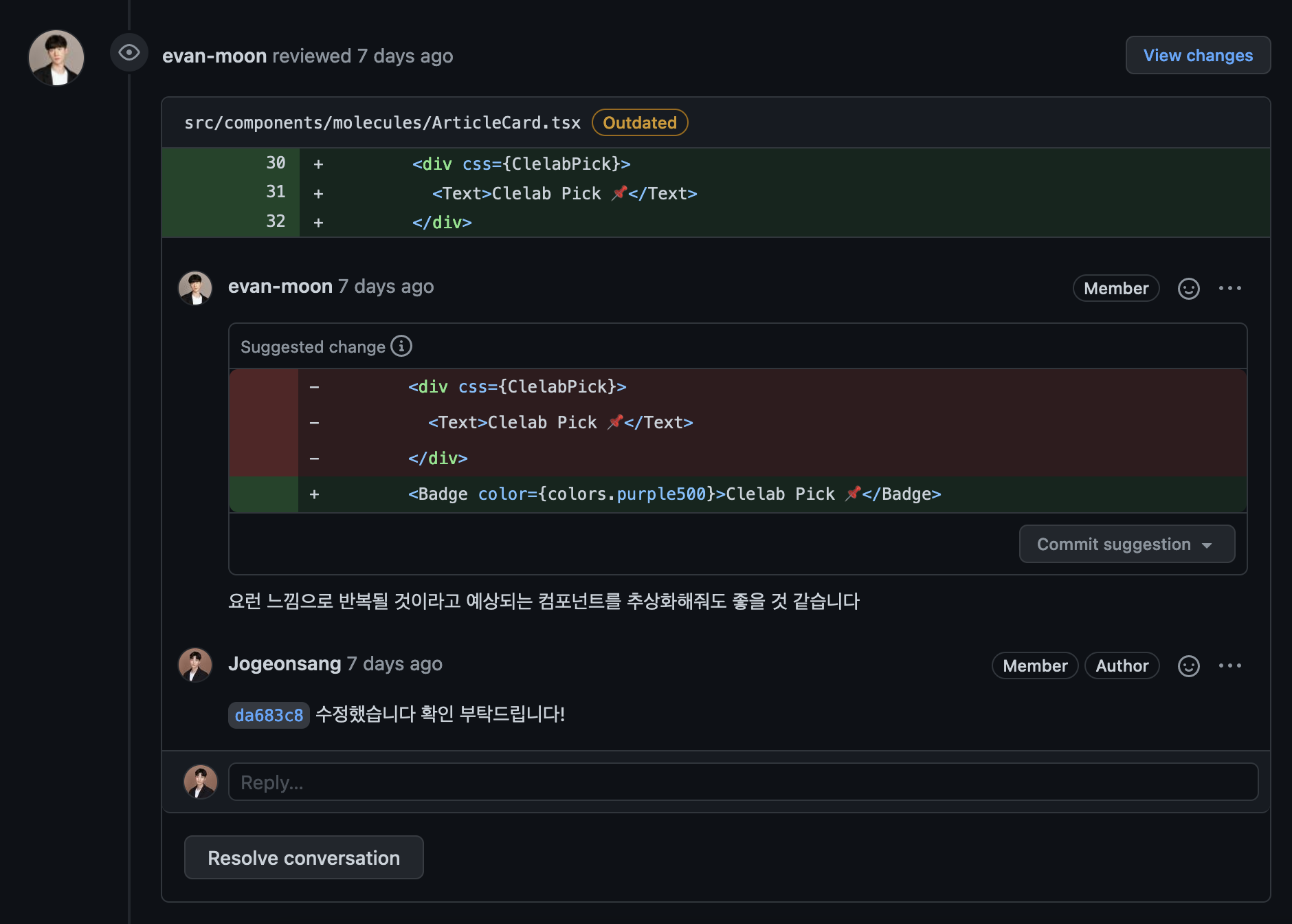 뭔가 스스로의 실력이 떨어진다는 생각을 해서 일까? 저는 다른 개발자분들이 요청하신 코드리뷰에 이렇다한 의견을 제시하지도 혹은 질문도 하지 않고 눈팅만 하고 있었습니다.